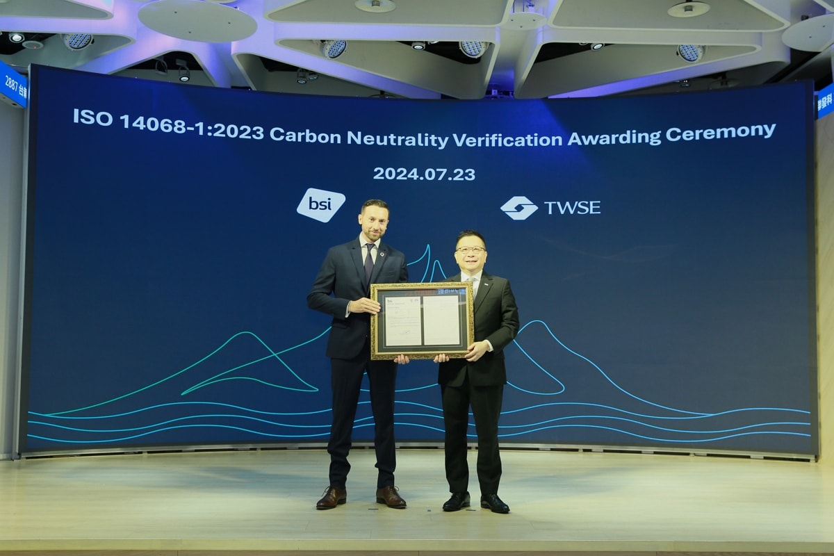 Taipei, Taiwan, July 31, 2024 – The British Standards Institution (BSI) announced that the Taiwan Stock Exchange (TWSE) has become the world's first stock exchange received the ISO 14068-1:2023 Carbon Neutrality verification from BSI. Harold Pradal, President of the Assurance Services division at BSI, visited Taiwan in person to present this certificate and commended TWSE for its outstanding efforts.